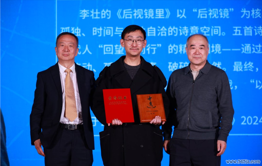 京城电通原董事长王军怀,《十月》原主编陈东捷为获奖诗东谈主李壮颁奖。